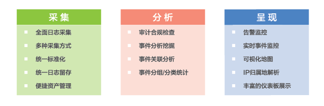 其它特点:可灵活定制的界面风格、展示布局、个人工作台和安全业务流程:快速的安装部署和简单可扩展的接口;稳定可靠的系统和无代理的采集方式;系统兼容支持IPV6。